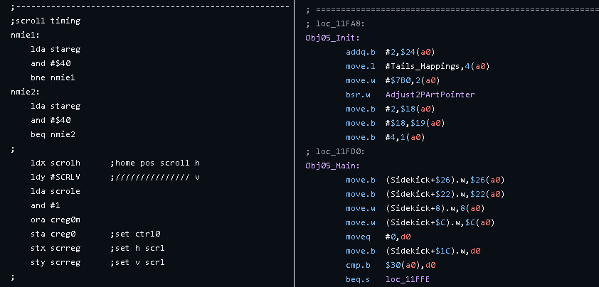 two snippets of code: assembly from Ninja Hattori-kun (Famicom), and assembly from Sonic 2 (Genesis). Both are still assembly, but they're entirely different languages.